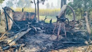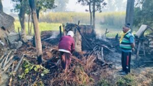 लगभग दो घंटे बाद आग पर काबू पाया जा सका।आग लगने से सुरेश के घर में रखा अनाज, कपड़े, बर्तन व चारा काटने वाली मशीन के साथ ही पूरी गृहस्थी जलकर खाक हो गई।खबर है, सुरेश पंजाब प्रांत के लुधियाना शहर में रहकर मजदूरी का काम करते हैं।पत्नी कल्पना दो दिन पहले अपने बच्चों को लेकर मायके चली गई थी।आग लगने का कारण अभी तक स्पष्ट नहीं हो पाया है।ग्रामीण ने बताया सुरेश की आर्थिक स्थिति कमजोर है। मजदूरी कर अपने परिवार का भरण पोषण करता था।मामले की जानकारी हल्का लेखपाल अरविंद कुमार को दी गई है। (रिपोर्ट नागेश्वर सिंह)